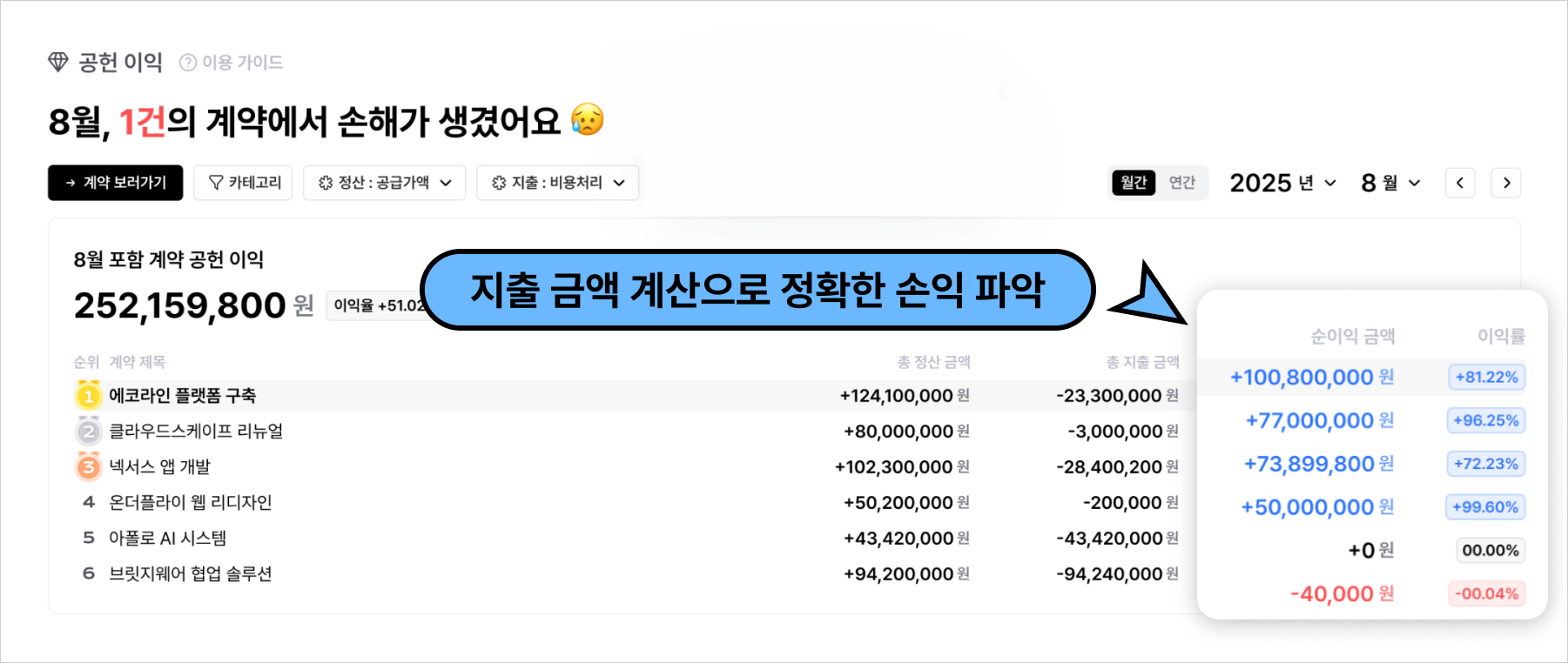 실제 이익률과 프로젝트별 손익까지 한눈에 확인할 수 있어요.