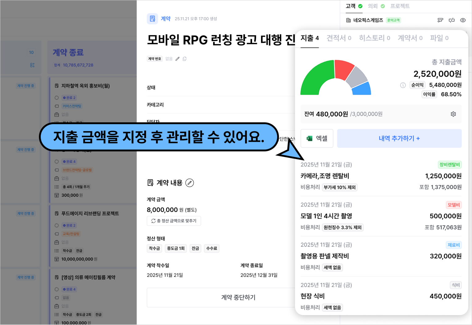 핵심은 계약 단계에서 예산을 설정하고, 프로젝트 진행 중 실지출과 자동 비교하는 건데요!