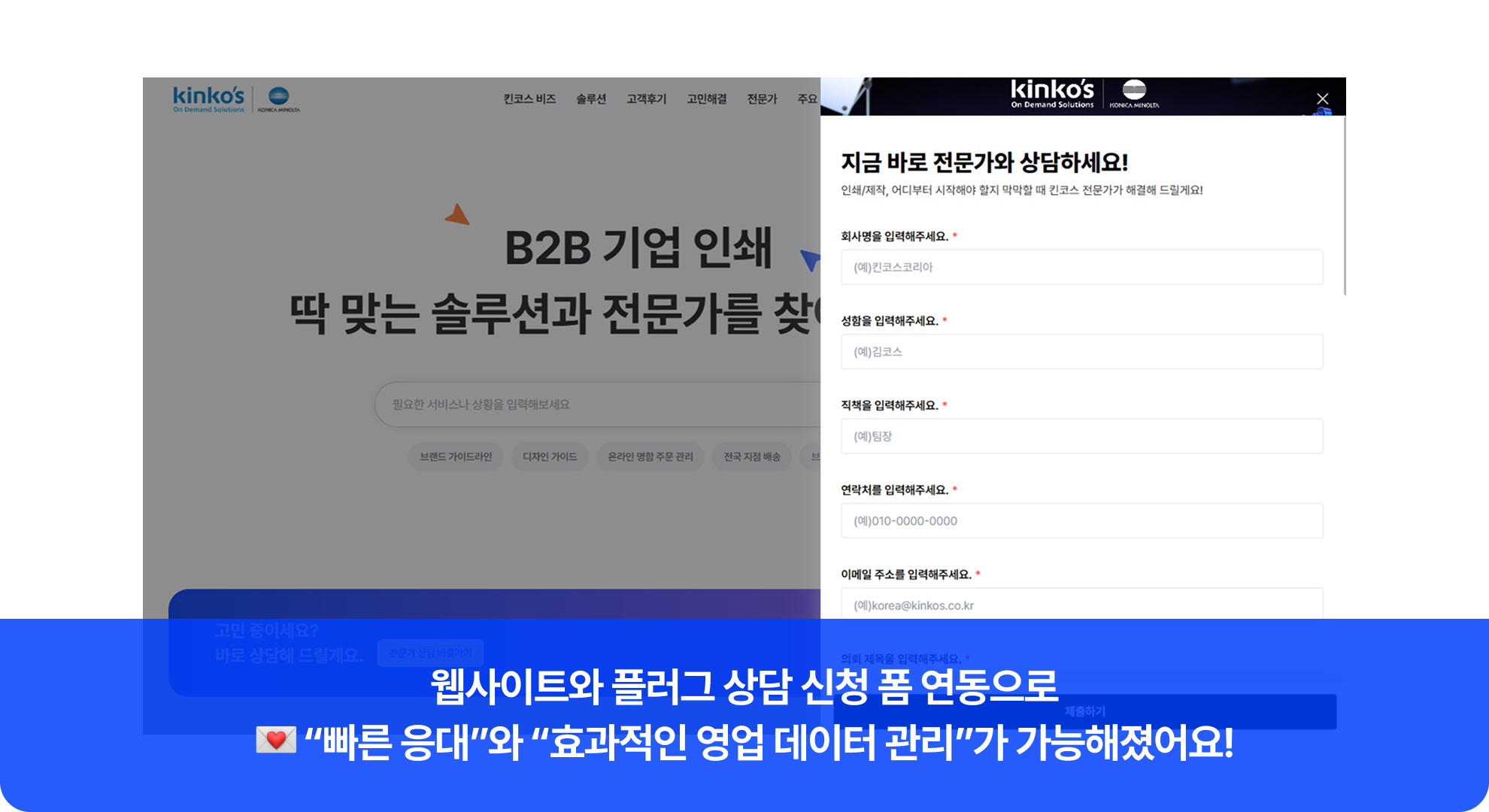 ▲ 킨코스 B2B 사이트와 바로 연동되는 플러그의 상담 신청 폼